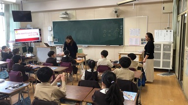 4年生の外国語活動の学習の様子です。今年度から、外国語活動、英語の学習は担任の先生ではなく、英語専科の先生とC-NET(ネイティブスピーカー)の先生で進めます。