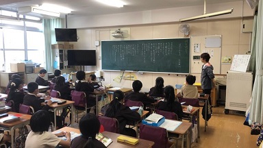 5年生の国語の学習の様子です。先生が黒板に記した詩を朗読しています。