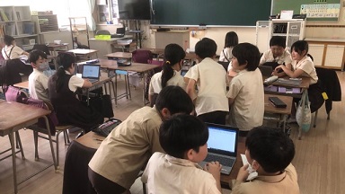 4年生です。6時間目は学級活動。学級の係活動を進めています。パソコンを使って学級新聞作成に取り掛かったり、朝の学習で行うクイズをパワーポイントに入力したりと、さすが高学年の仲間入りをした4年生。係活動にも創意工夫が見られます。