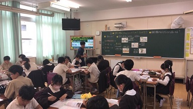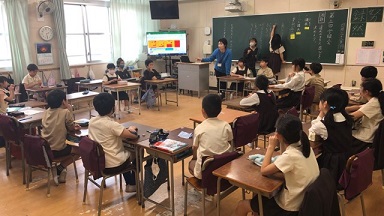 4年生です。学級活動の時間のようで、学級会が開催されていました。議長席も作られ「コの字」の形に机も並べて場づくりも本格的でした。