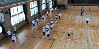 体育の学習の様子です。ゲーム領域の「鬼遊び」の学習です。一定の区域で逃げる、追いかけるなどの簡単なルールで鬼遊びをするのも、低学年の体育学習の内容です。