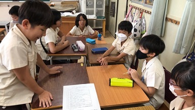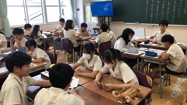 夏休みにあったできごとを交流しあうのも、始業式の日の学習活動でよくみられる光景です。(写真上 1年2組)