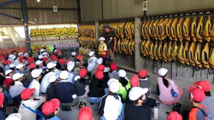 まずはライフジャケットの着方を教えていただきました。その後、4メートル重さ8キロの櫂の持ち方を教えていただきました。
