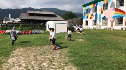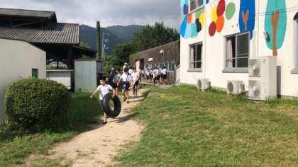 あ組、い組は前半は筏づくりです。まずは材料(大きなタイヤチューブ、板、ロープ)を運んできます。