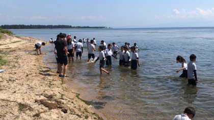 あ組、い組は湖畔散策です。膝ぐらいまで入って気持ちよさそうです。