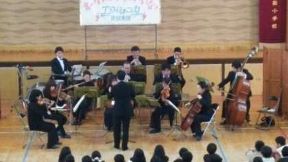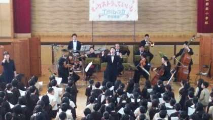オーケストラの方々と一緒に「となりのトトロのさんぽ」を全員で歌いました。また、高学年では、「つばさをください」を歌ったり、「オーラリー」をリコーダーで演奏したりしました。指揮者の体験までさせていただいて子どもたちは大喜びでした。低学年も高学年も生の演奏に感動していました。
