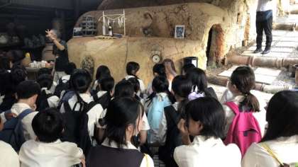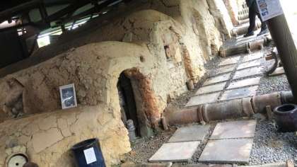 登窯の前で、信楽焼についての説明を聞いています。この後、お楽しみの陶芸体験です。