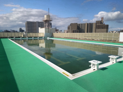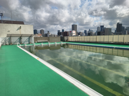 たいいくかんの おくじょうには、おおきくて ひろい ぷうるが あるよ。
