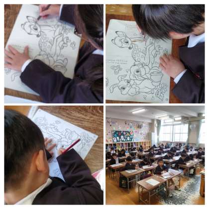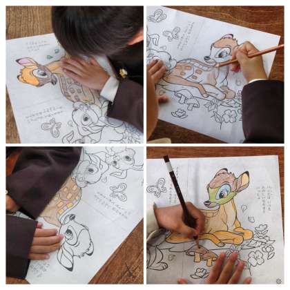 教室で、色えんぴつで塗り絵をしています。