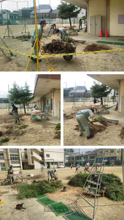 校園営繕園芸事務所のみなさんにお越しいただき、講堂の前の3本の樹木のうち、古くなって倒れる恐れのある2本を切りました。