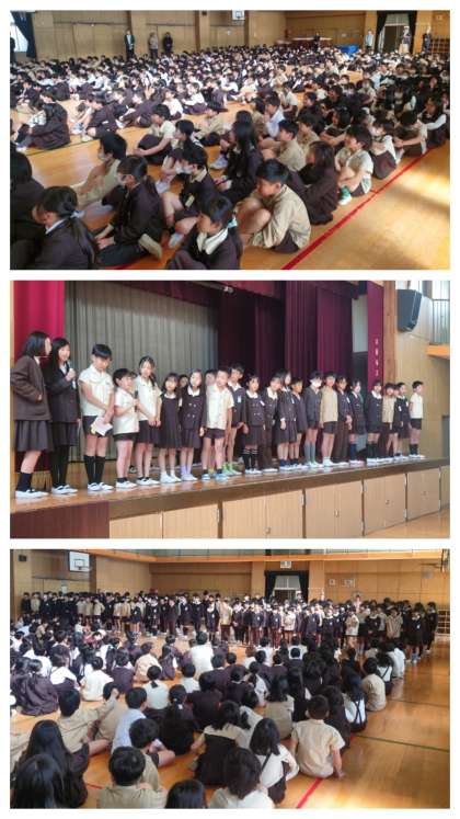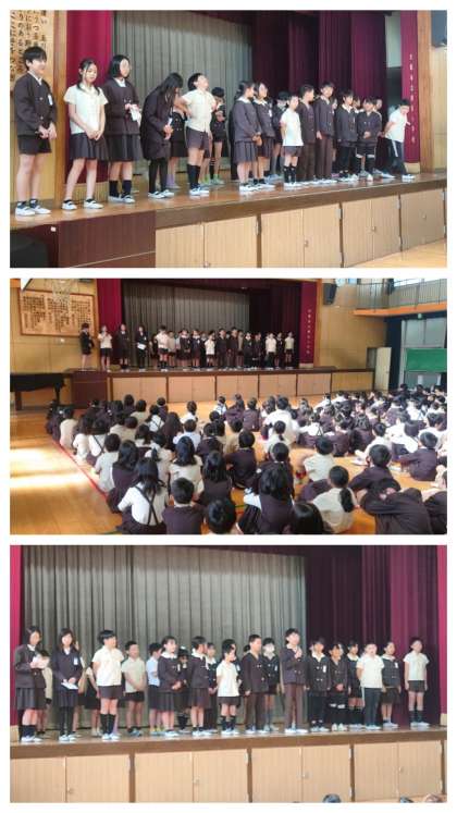 今朝の児童集会は、全校の子どもたちが講堂に集まって行いました。