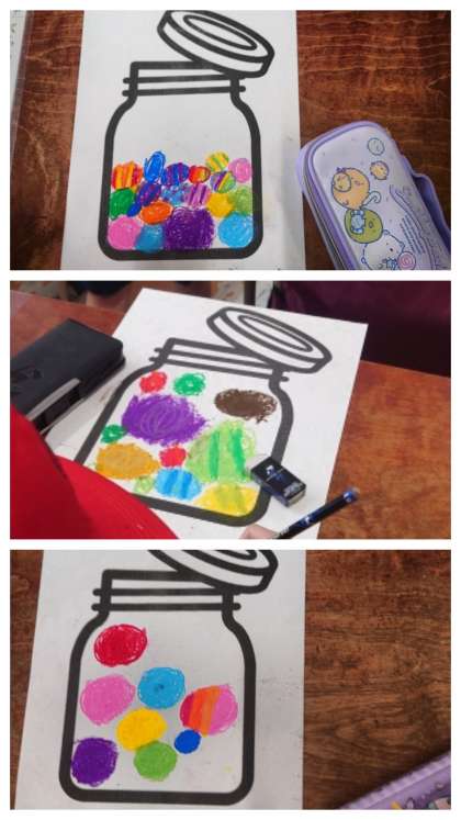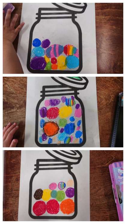 図工科の時間は、画用紙のびんの中に、パスを使っていろいろな大きさのあめをいろいろな色をつかって描きました。