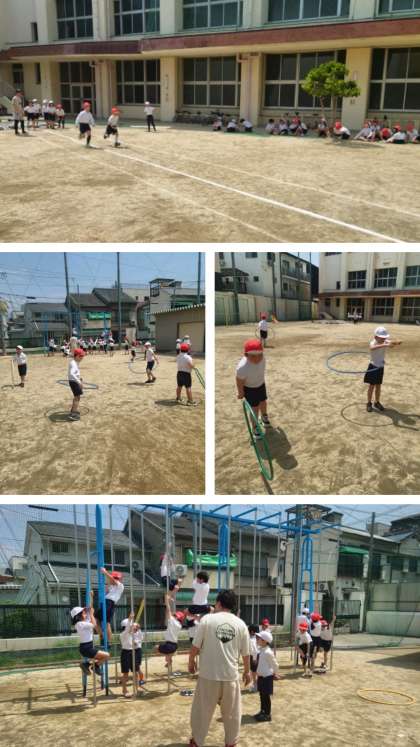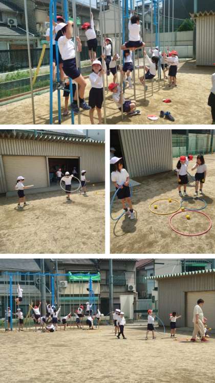 待っている間に、のぼり棒をしたり、フープをしたりしながら体を動かしました。