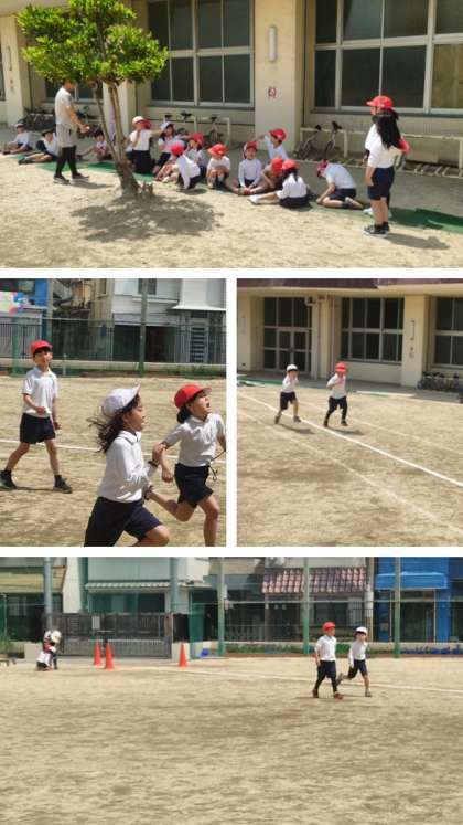 体育科の時間は、運動場で2クラス合同で学習しました。