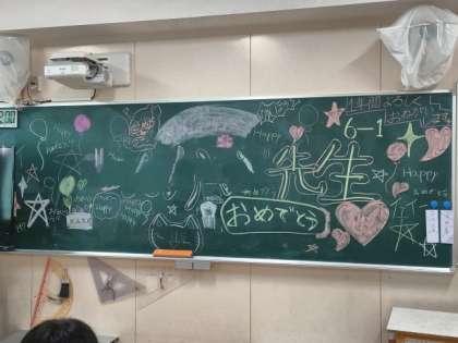 子どもたちが黒板いっぱいにメッセージを書いてお祝いしました。