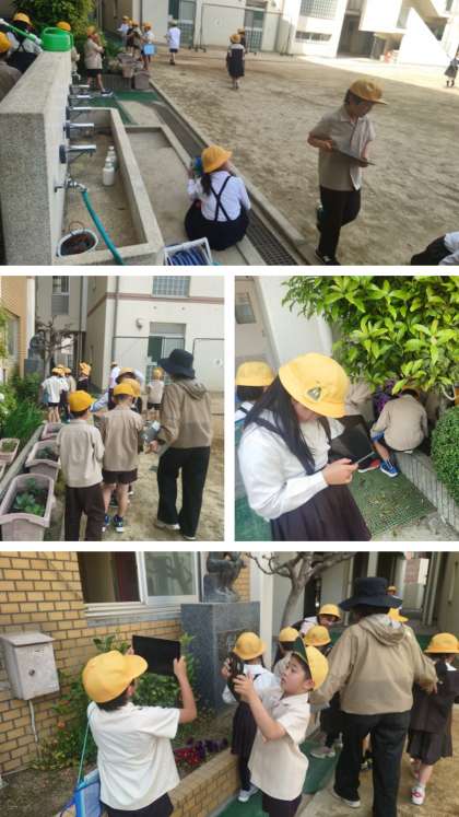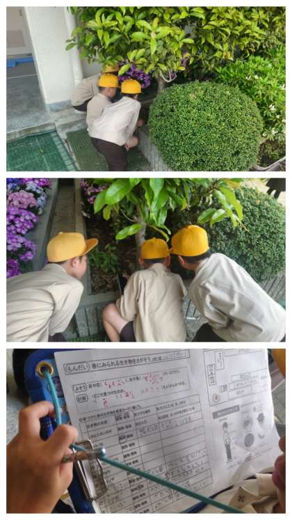 理科の時間は、校庭で春の生き物をさがして、見つけた生き物の名前や場所、気付いたことをワークシートにメモしていきました。