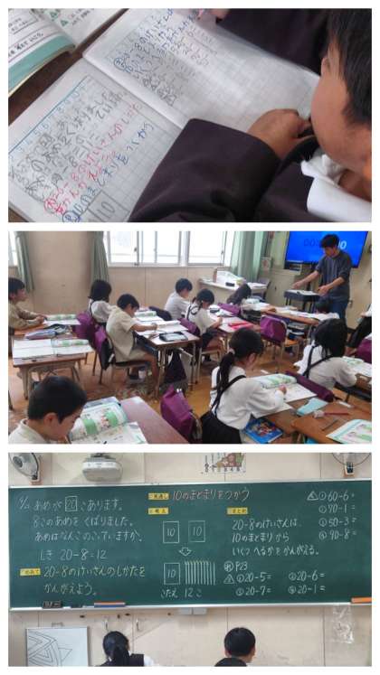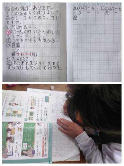 「あめが20こあります。8このあめをくばりました。あめはなんこのこっていますか。」の問題について考えました。