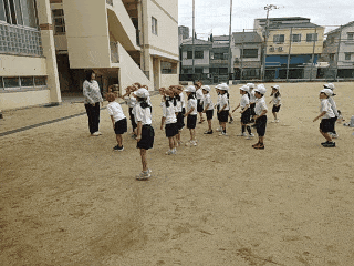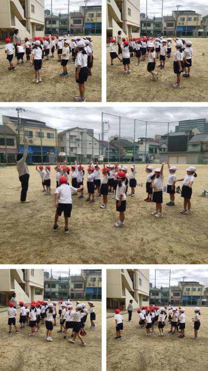 「言うこと いっしょ、やること はんたい!」のかけ声のあと、担任が「右!」といえば左へ、「前!」といえば後ろに動かないといけません。