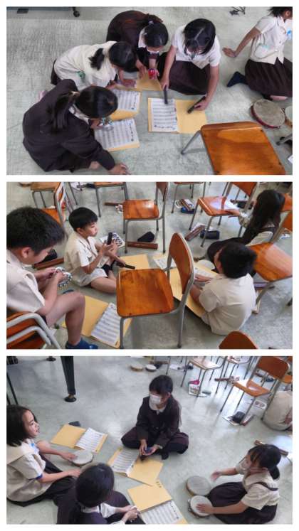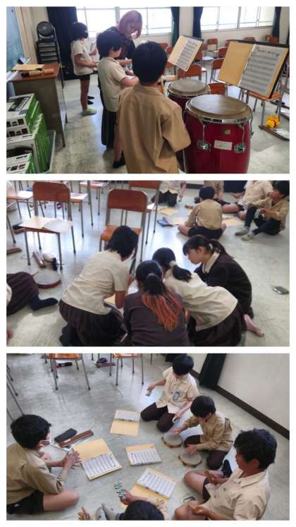 音楽科の時間は、ディズニー音楽の「アンダー・ザ・シー」の曲に合わせて、いろいろな打楽器でリズムを打つ練習をしました。