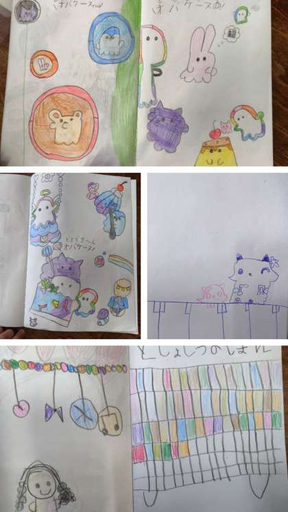 1年生の子どもたちが自由帳に描いたイラストです。 かわいいですね。