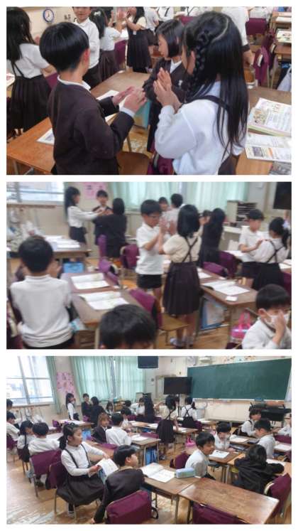 音楽科の時間は、教科書の「はしの 上で」の歌に合わせて、友達と2人で手遊びをしながら歌いました。