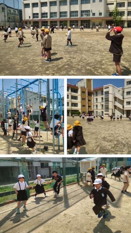 たくさんの子どもたちが運動場で元気よく外遊びをしています。