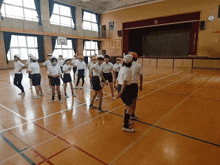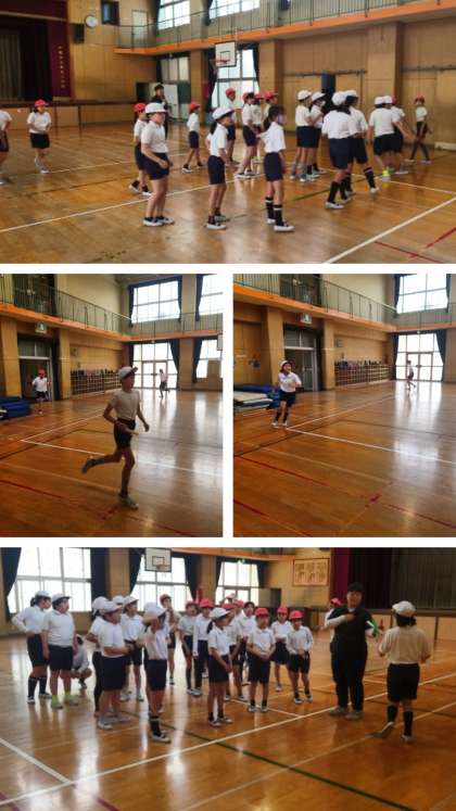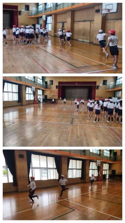 体育科では、体育館で、チームに分かれてリレーの練習をしました。