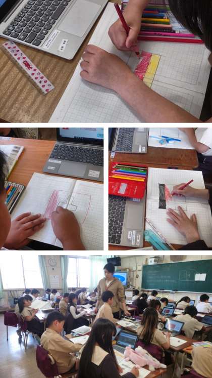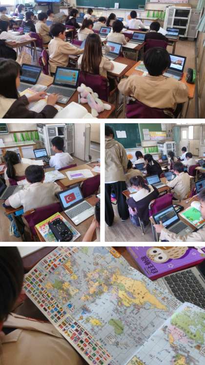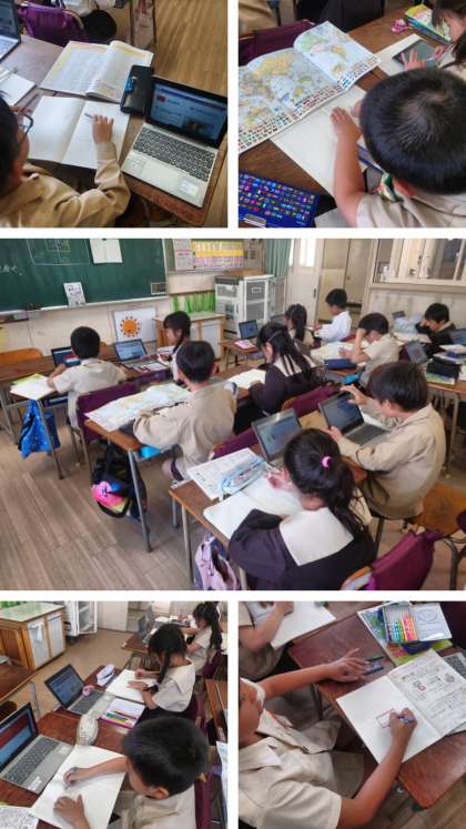 総合的な学習の時間は、大阪・関西万博に参加している158か国の中から1つ選んで、まず地図帳で場所を国旗を見つけ、学習者用端末を使って、その国について詳しく調べてノートにまとめました。