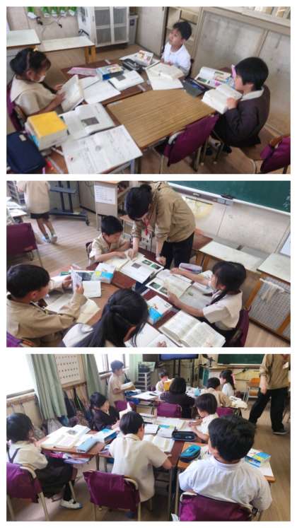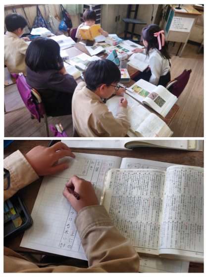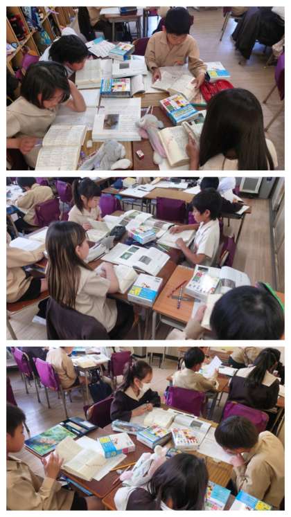 国語科の時間は、辞書を片手に「しぜんのかくし絵」に出てくる言葉の意味を調べました。