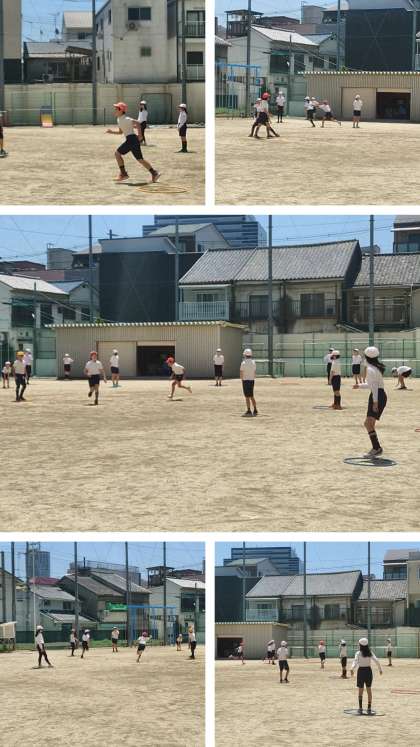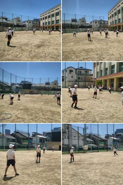 まず、フラフープを転がして2人組で「キャッチボール」をしました。