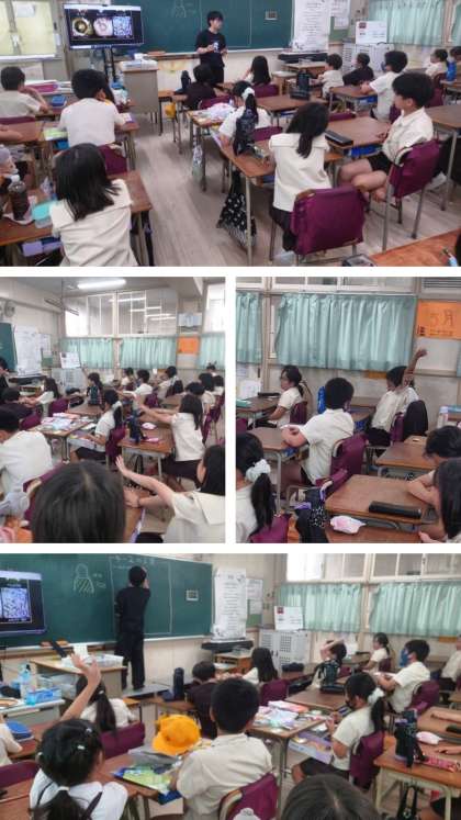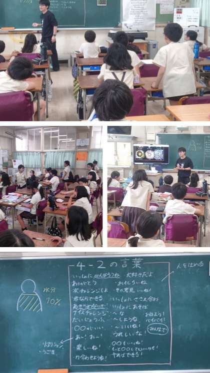 よい音楽を聞かせたときに水が美しい結晶を見せるとする著作をもとに、「元気で明るくなる言葉」はどんな言葉か、みんなで話し合いました。