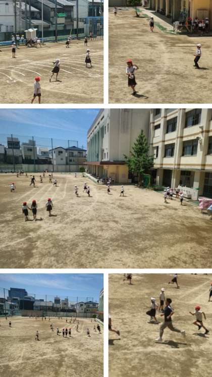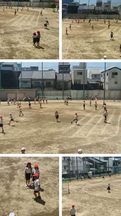 たくさんの子どもたちが運動場で元気よく外遊びをしています。