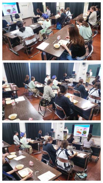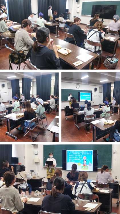 給食を食べながら、本校の栄養教諭から、給食のねらい、内容、食材、栄養、アレルギー対応の話や、その他に気をつけていることなど、資料とパワーポイントを使って話をしました。