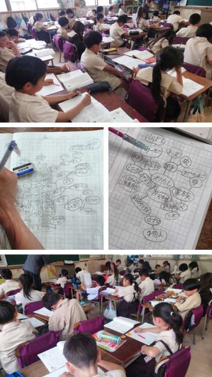 今日は、書きたい中心を決めて、ウェビングでイメージを広げ、「組み立てメモ」をノートに書いていきました。