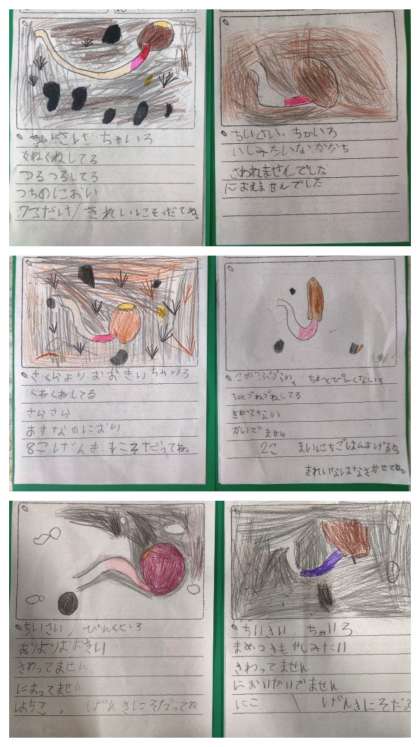 生活科の時間は、一人一人が育てているあさがおを観察し、カードに絵をかいて記録しました。