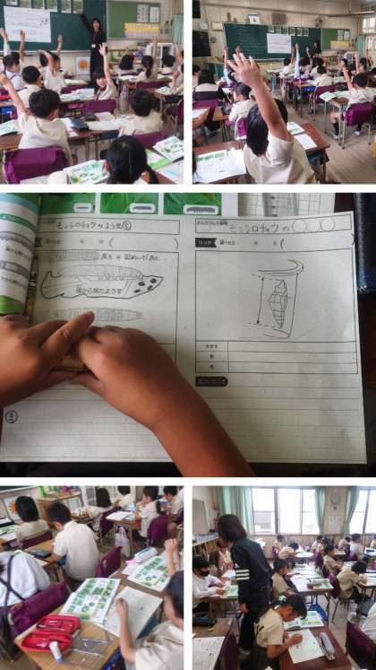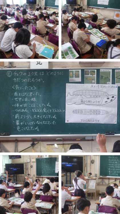 理科の時間は、チョウのよう虫を観察して気付いたことを出し合い、ノートにまとめました。