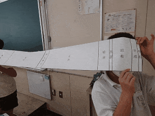 縄文時代から令和までのそれぞれの時代の時間の長さを1本のテープに表すと・・・縄文時代が思っていたよりもずいぶん長いことに驚きました。