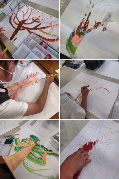 今日は、木の下絵をもとに絵の具で色をつけていきます。