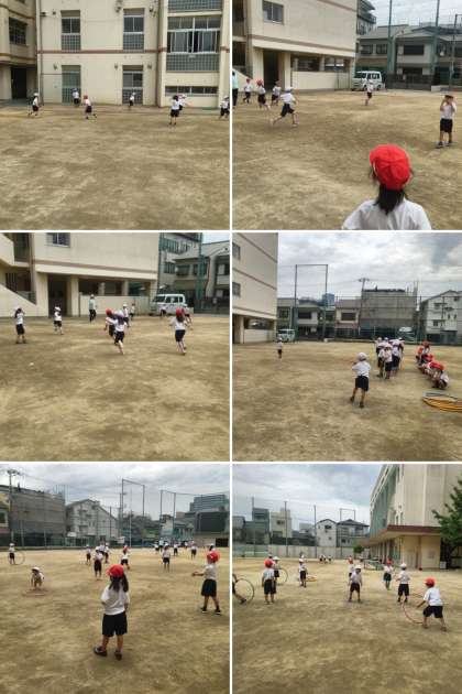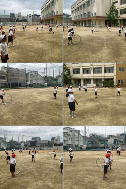 体育の時間は、「だるまさんがころんだ」や「おにごっこ」をしてみんなで遊んだあと、フープを回して友達とパスをしました。