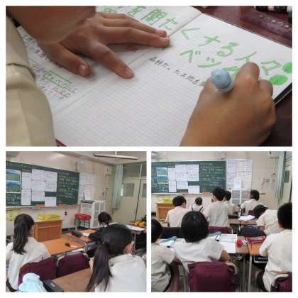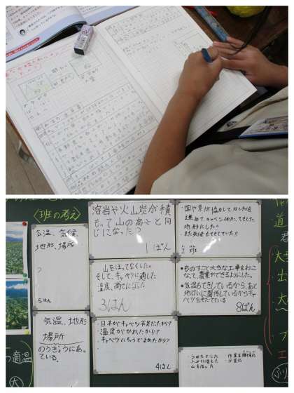 社会科の時間は、山に囲まれた高い土地にある群馬県嬬恋村のようすについて調べました。