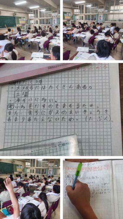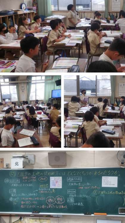 社会科の時間は、住宅地や工場、商店、田や畑、公園など、大阪市の土地の使われ方にはどのような特徴があるのかみんなで調べました。