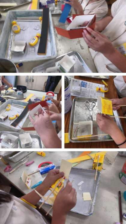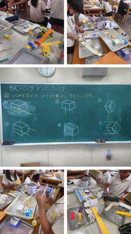 紙パックにわりばしを付けると動く仕組みができ、付け方によって動き方が変わります。