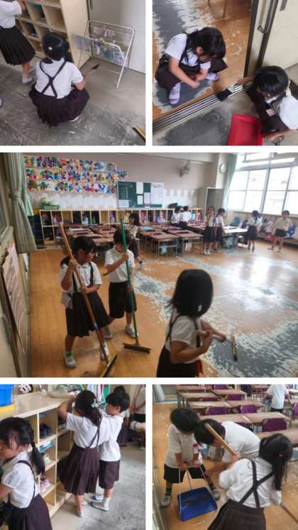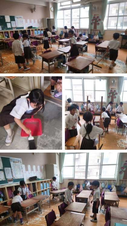 子どもたちが一生懸命教室やろうかなどをきれいにしています。