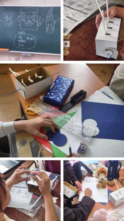 クランクの仕組みを動かしながら、思い付いたことを工夫してつくっていきます。