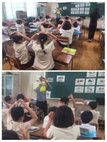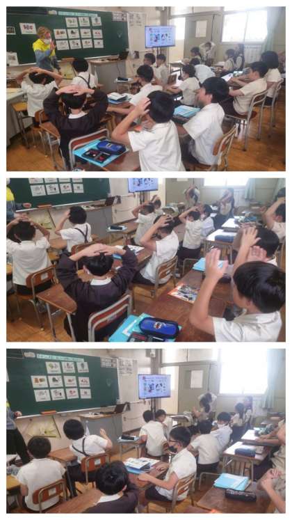 次に、"math""social studies""Japanese""music""P.E.”など、「教科」を表す英語の表現について「キーワードゲーム」で楽しみながら練習しました。