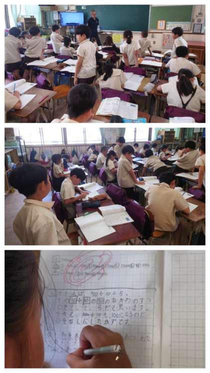 一の位が0の数を10でわると、位が1つ下がり、一の位の0をとった数になることがわかりました。