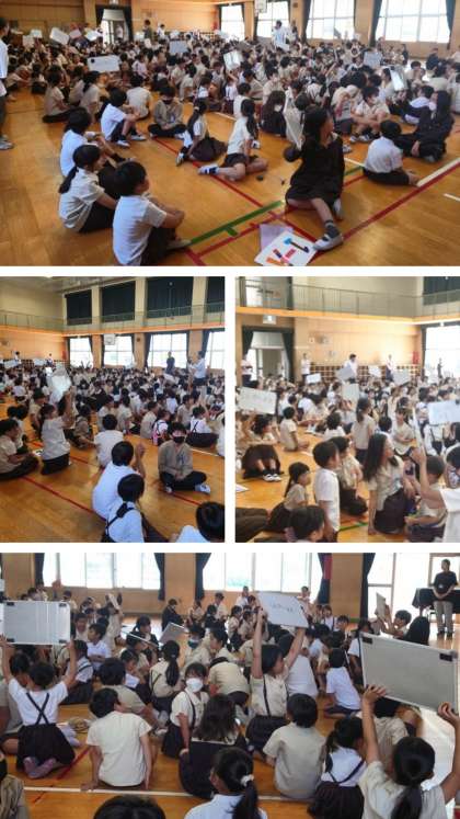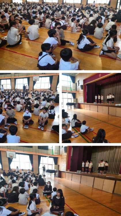 毎週木曜日に、全校児童がたてわり班ごとに講堂に集合して児童集会を行っています。