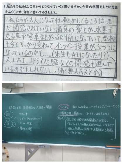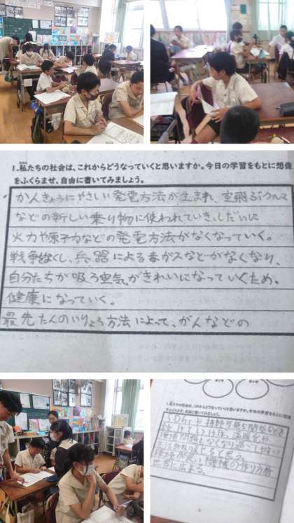 今日は、これからどのように学習していくのかを見通し、「私たちの社会がこれからどうなっていくと思うのか」自分が考えたことをワークシートにまとめました。