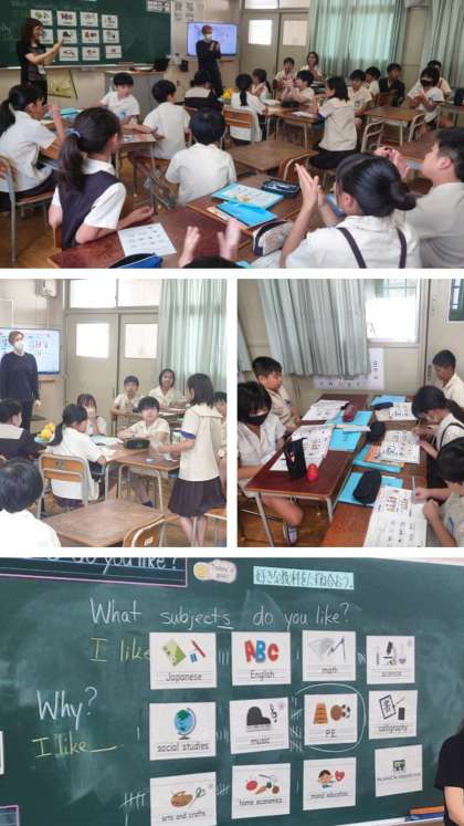 外国語科の時間は、"What subjects do you like?""I like〜.""Why?""I like〜."の表現を使って、自分の好きな教科や、その理由をたずね合う英語の表現について学習しました。