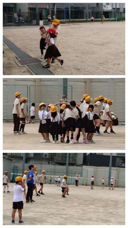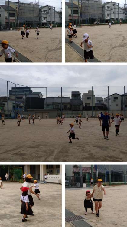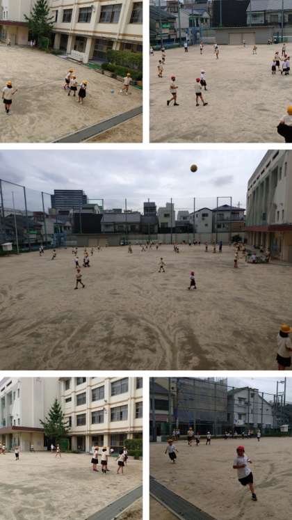 朝からの雨があがり、子どもたちが運動場で元気よく外遊びをしています。